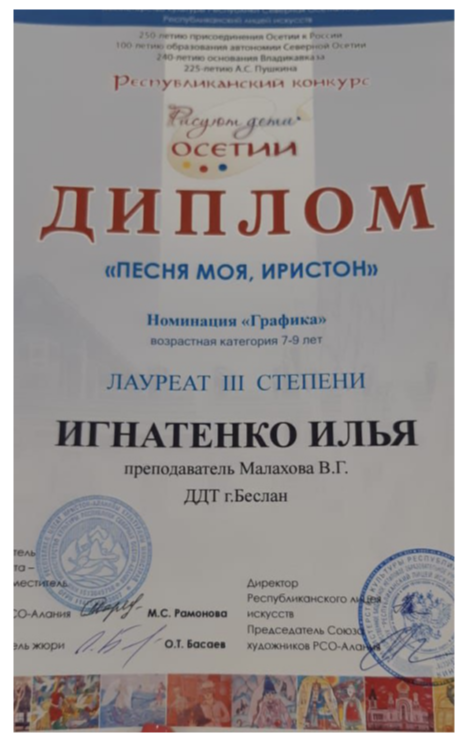 3. Черткоев Рустам, Гудиева Замира, Гатаев Марат, обучающиеся тв. объединения «Funny Englisch» (ПДО Худиева И.С.) награждены дипломами «За высокий уровень замысла в исполнении»;
