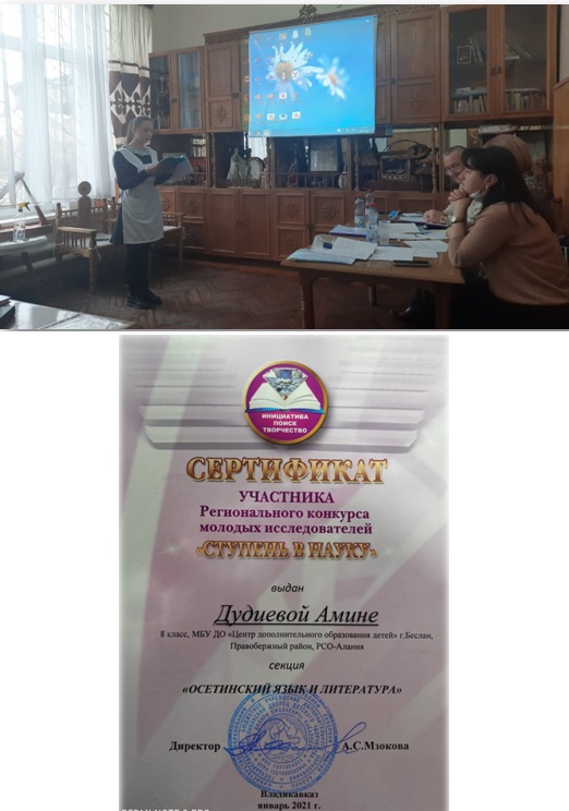 В секции «ОСЕТИНСКИЙ ЯЗЫК И ЛИТЕРАТУРА» - старшая возрастная группа (8-11 кл.) с темой: «ФЫДЫБÆСТÆН ЙÆ ХÆС БАФИДЫН – СЕ СТЫРДÆР БÆЛЛИЦ» выступила ДУДИЕВА Амина Олеговна, обучающаяся творческого объединения «Фидан» МБУДО «Центр дополнительного образования детей» (научный руководитель: Хадикова Альбина Алимбековна, педагог дополнительного образования), получила сертификат участника и была награждена ценным призом.